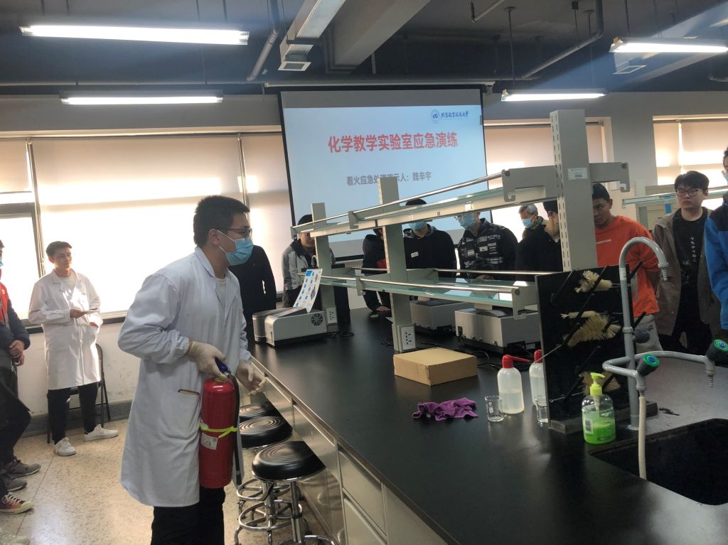 为了进一步加强学校安全工作,增强化学实验教学中心师生安全意识,提高学生对实验安全应急处置能力,本着坚持“安全第一,预防为主”的方针和“以人为本”的思想,2021年11月24日化学实验教学中心(平台)在实验楼1号楼301室进行了实验室安全培训及应急演练。中心全体实验室负责教师和2018级本科生(2022年毕业班)及10余名博、硕士研究生等50余人参加了本次演练。