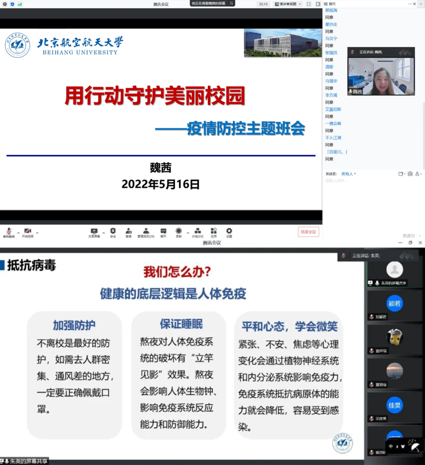 beat365在线唯一官网班主任、辅导员以“共克时艰,守护美丽校园”为主题面向学院全体学生召开班会,发出拒绝外卖、减少快递、守护美丽校园的倡议,将学校的暖心举措详细告知同学们。同学们纷纷表示,大爱暖心北航,要用行动守护美丽校园。