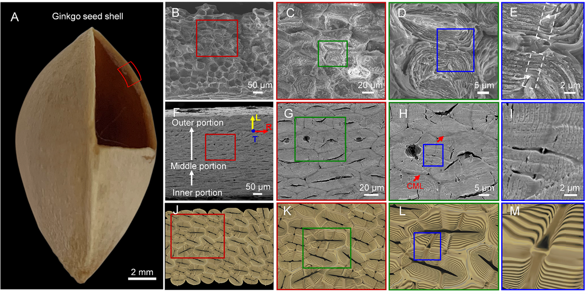 鉴于此,程群峰教授团队研究发现了银杏果壳的石细胞“互锁”的独特结构,它在不同方向上都具有优异的抵抗裂纹扩展的能力。银杏果壳整体具有纺锤形的外表(图1A),通过大量具有厚细胞壁的多边形石细胞紧密地结合在一起形成(图1B、C,1F、G和1J、K)。石细胞的内部次生壁中是半径约为1.2微米的细长管道,即纹孔(图1D、H、L)。这些纹孔从细胞中部的空腔延伸至胞间层,与相邻石细胞的纹孔形成“纹孔对”结构(图1E、I、M)。