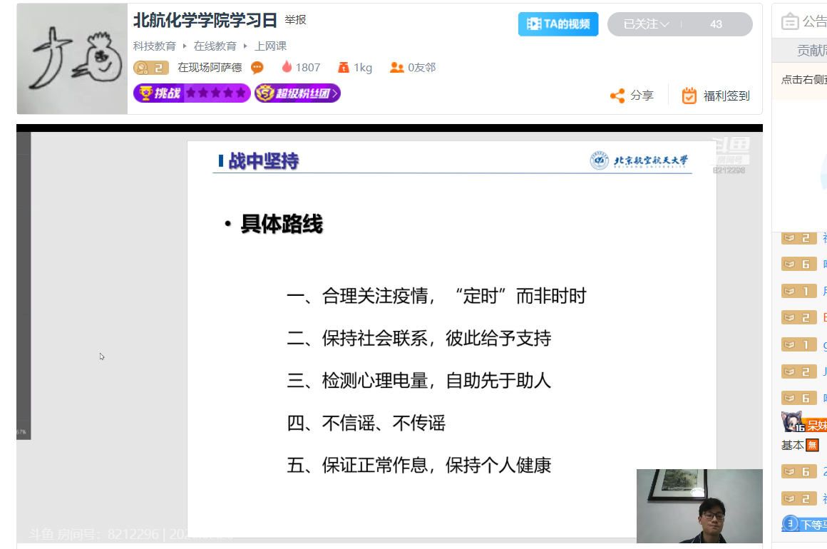 2月26日,beat365在线唯一官网全体本科生、研究生开展“学习日”活动,主要内容为首日教育以及疫情防控知识学习,通过线上直播讲解和视频播放方式进行。学习日活动由各年级辅导员主持。