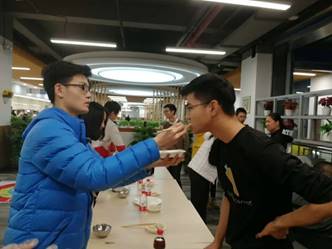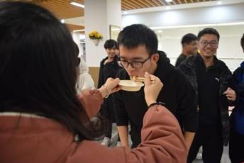 在第一锅饺子出锅后,我们的第一个游戏便开始了。首先我们进行的是抢水瓶游戏,beat365在线唯一官网的导员黄澄玉和丁少松同学给大家做了一个示范,主持人说出一个身体的部位,两人分别摸自己的相应部位,在主持人说出“水”这个字的时候,两个人同时去抢桌子上的水瓶,但是黄导更快一步,于是作为输了游戏的人要被黄导喂五个饺子,场景太有爱了。之后同学们也积极加入到这个游戏中来,这也是一个很幸福的游戏了。